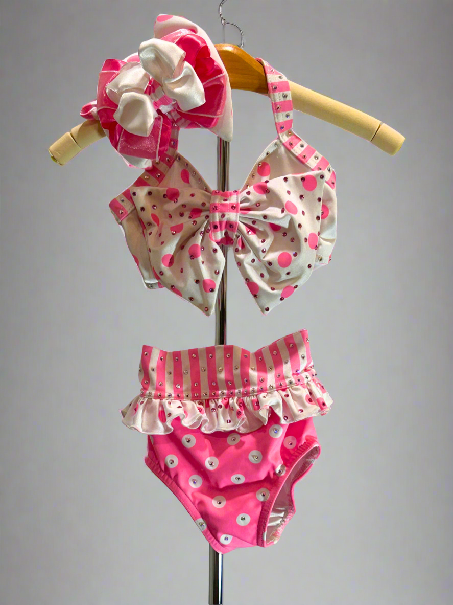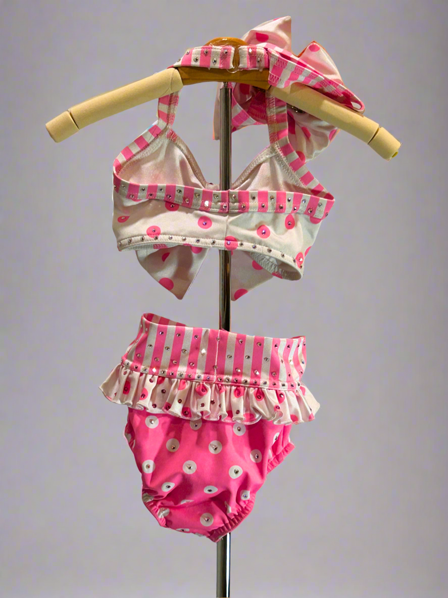 This fun beach themed costume is so cute. There are crystal rhinestones scattered all over the top and bottoms. Includes matching hair bow and striped headband.
