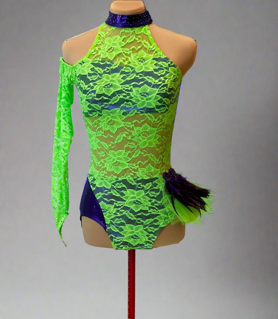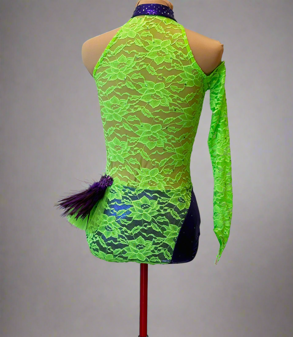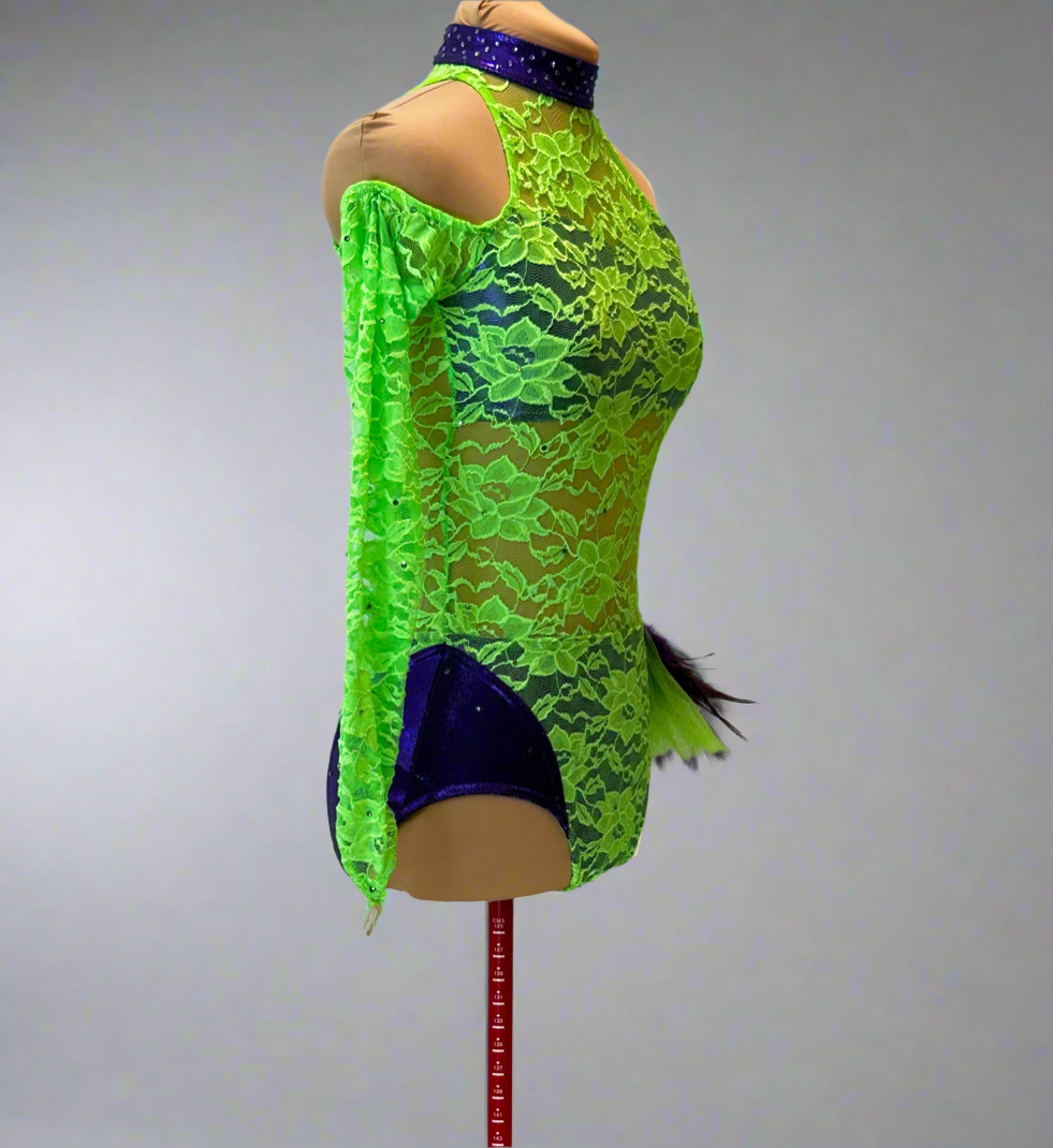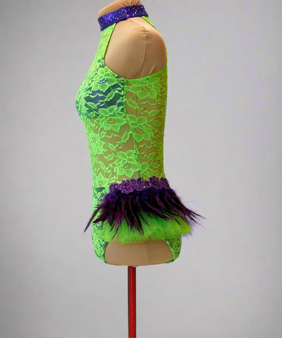 Neon green and iridescent purple bodysuit. The high neck band is trimmed in purple rhinestones. The lace bodysuit is scattered with green rhinestones. The left hip has attached green and purple feathers with purple appliqué.