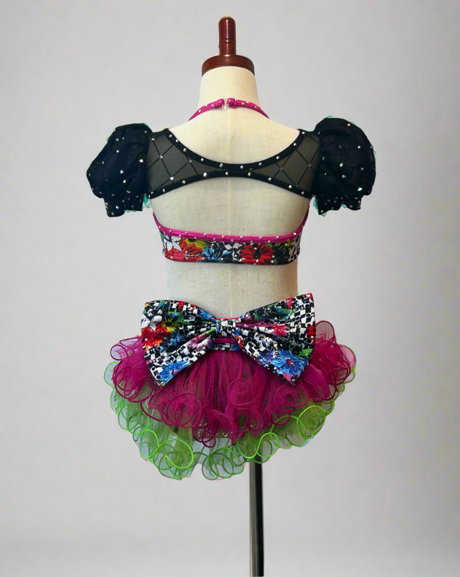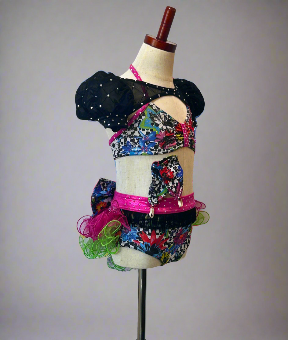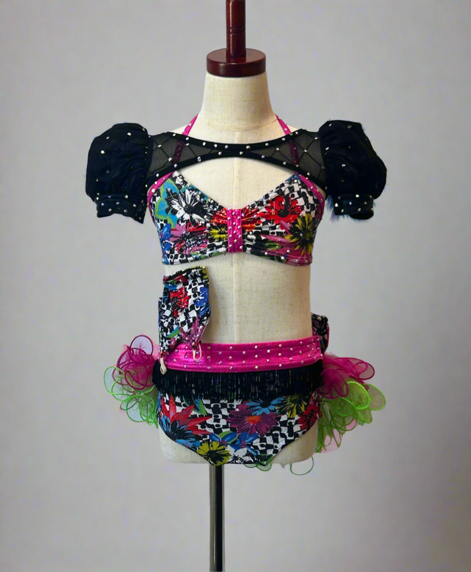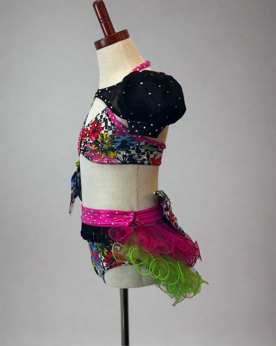 This custom costume is so sassy. The colors really pop on stage and there are crystal rhinestones all over the costume. It is three pieces, the bottoms, halter top and detached sleeves. Includes matching gauntlet gloves.