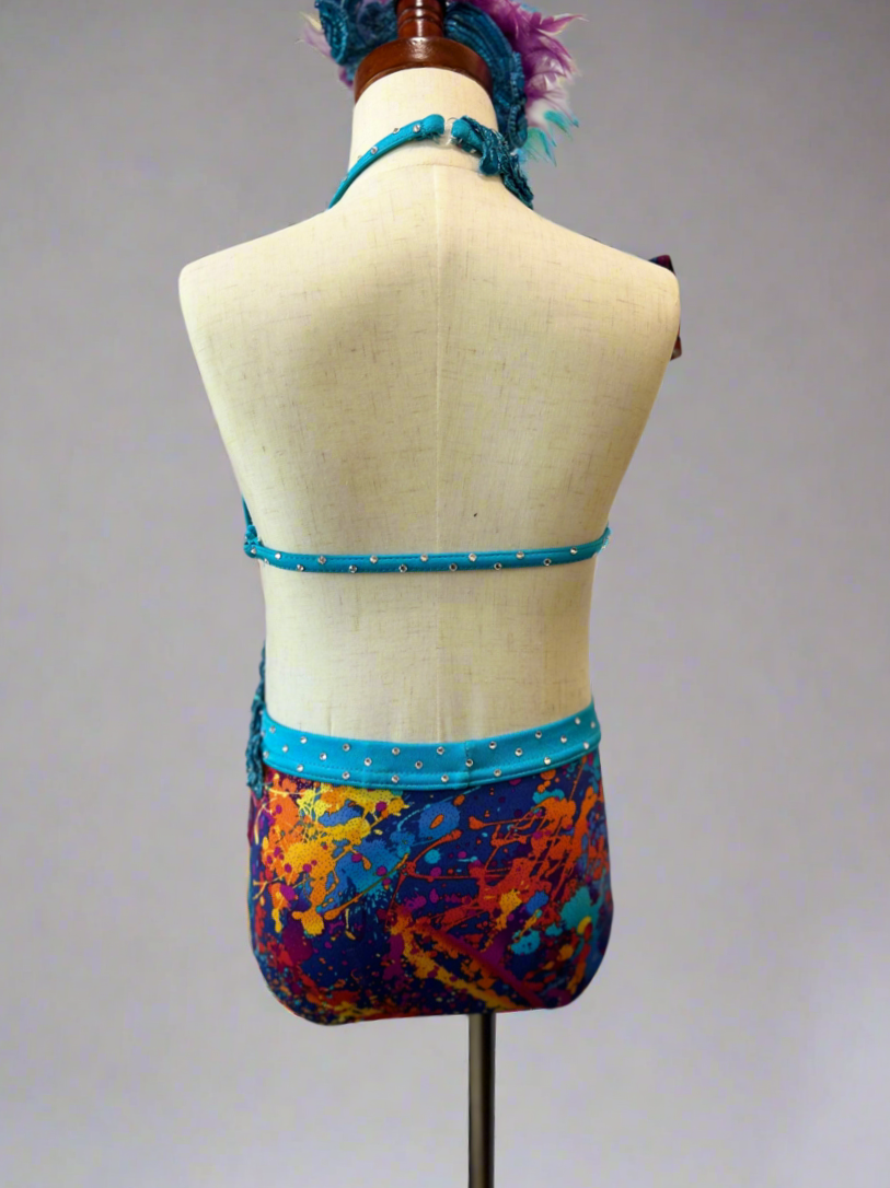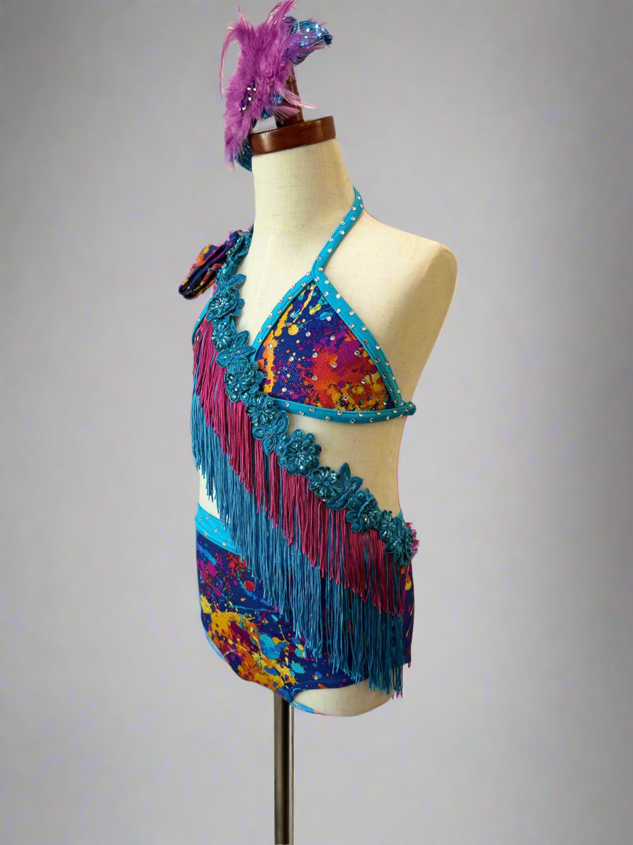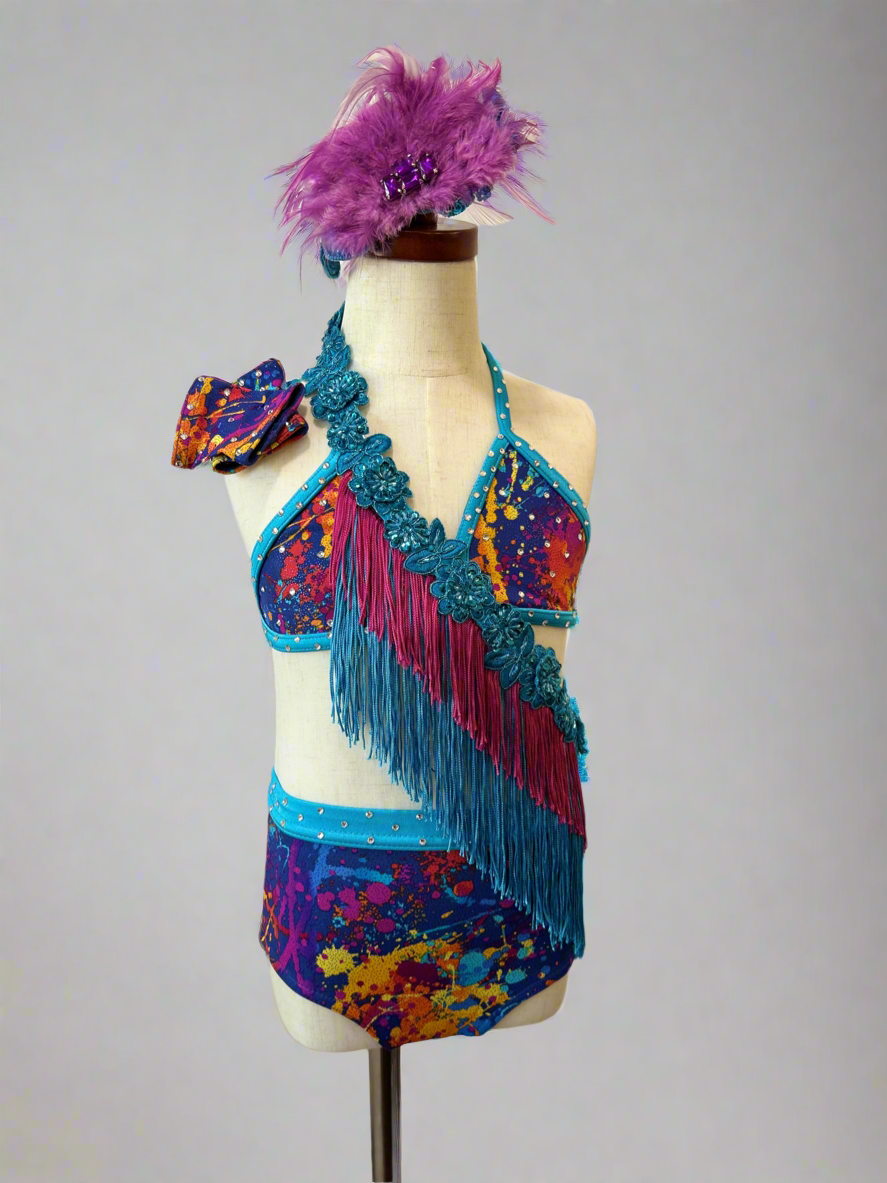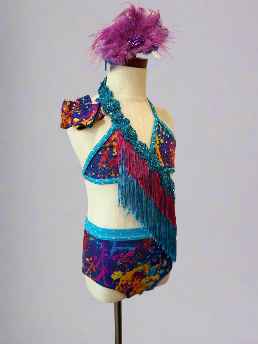 This custom costume features a top and bottom two piece with fun fringe details adorned with crystal rhinestones. The fabric is splattered with vibrant turquoise, purple, orange, and pink colors, adding pops of brightness. Accessories include matching wrist bands and an appliqué hair clip with feather details.