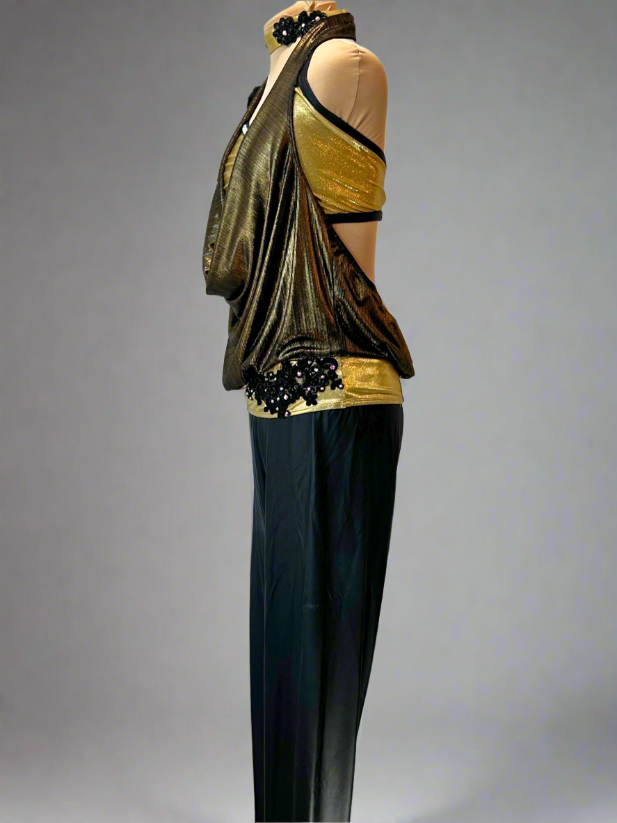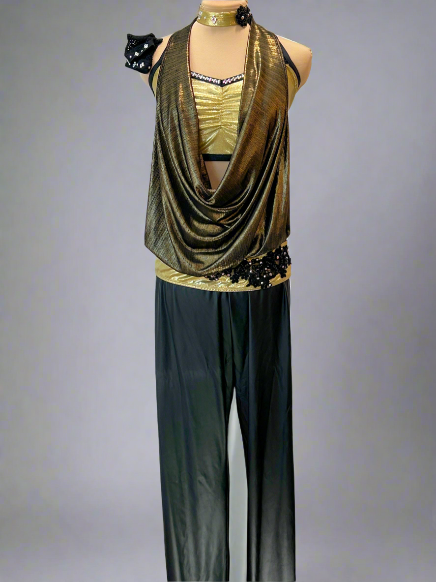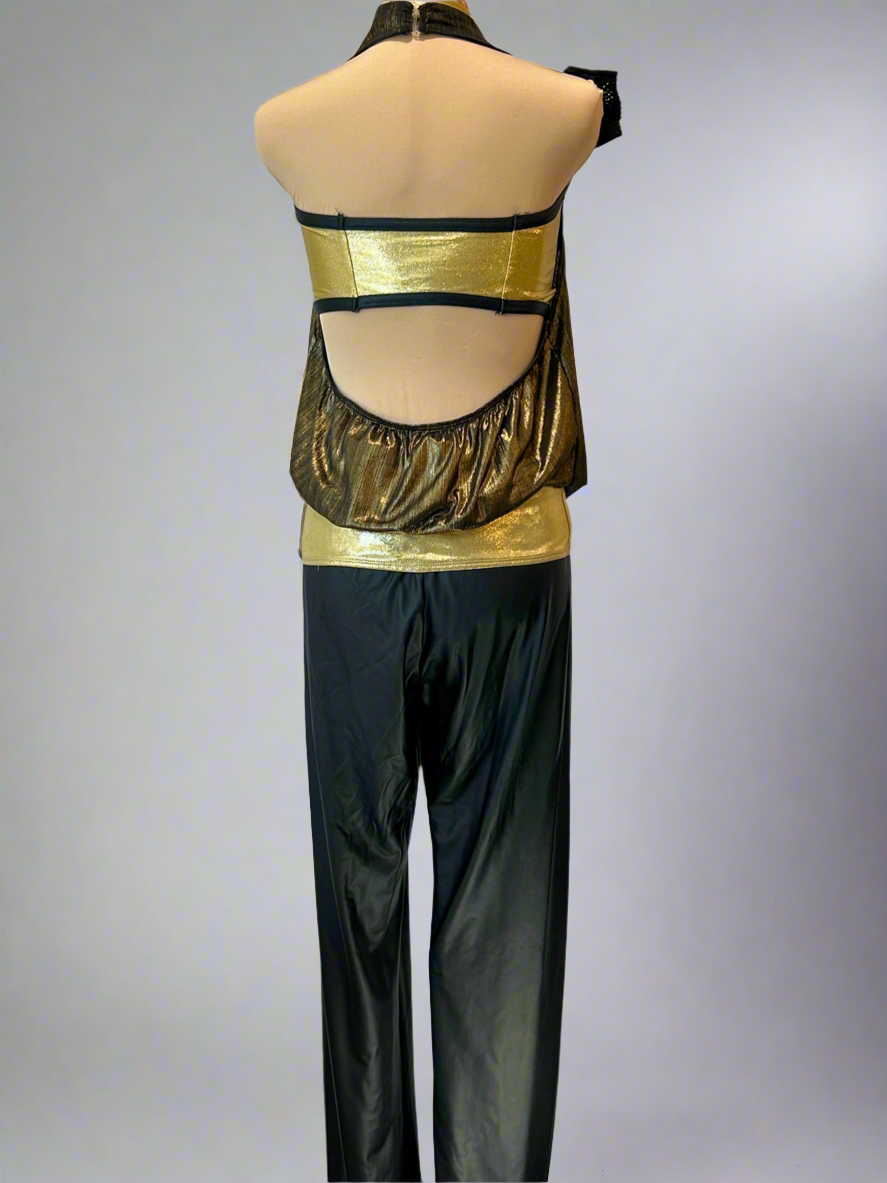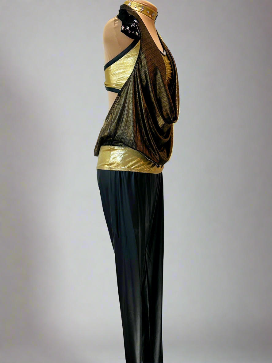 Super fun custom costume in gold and black. The stretch pleather leggings have a stretch waistband. The gold draped cowl neck top is attached to the gold bra top with a black appliqué on the hip. The top is lined with AB rhinestones. Includes gold choker and gauntlet mesh gloves with rhinestones.