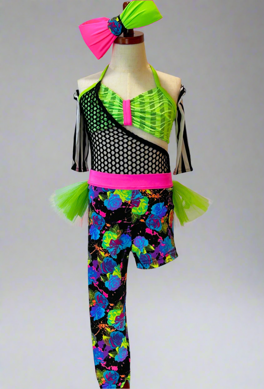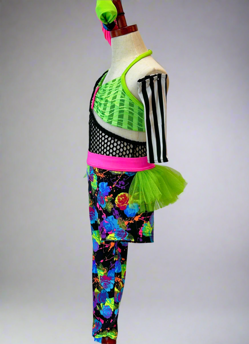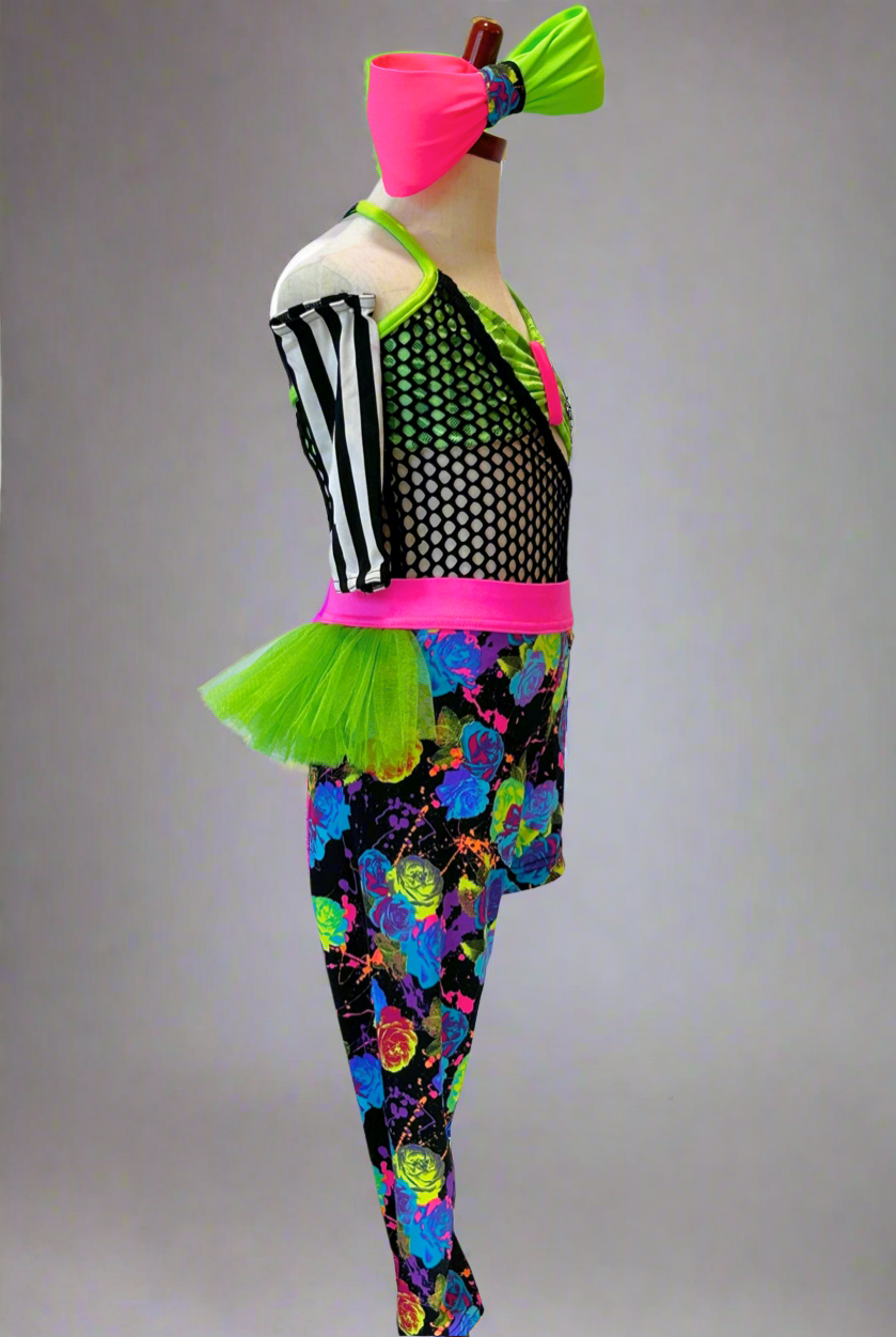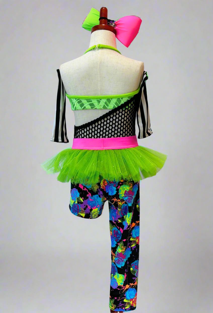 Super fun custom costume in neon colors. The leggings with attached tricot tutu is separate from the leo and green top. Includes black and white striped arm sleeves and giant bow.