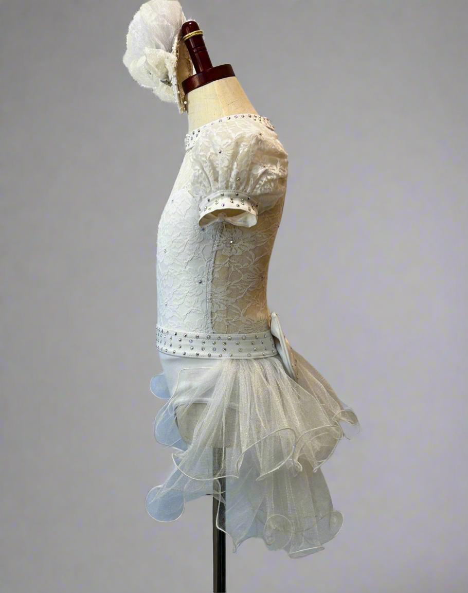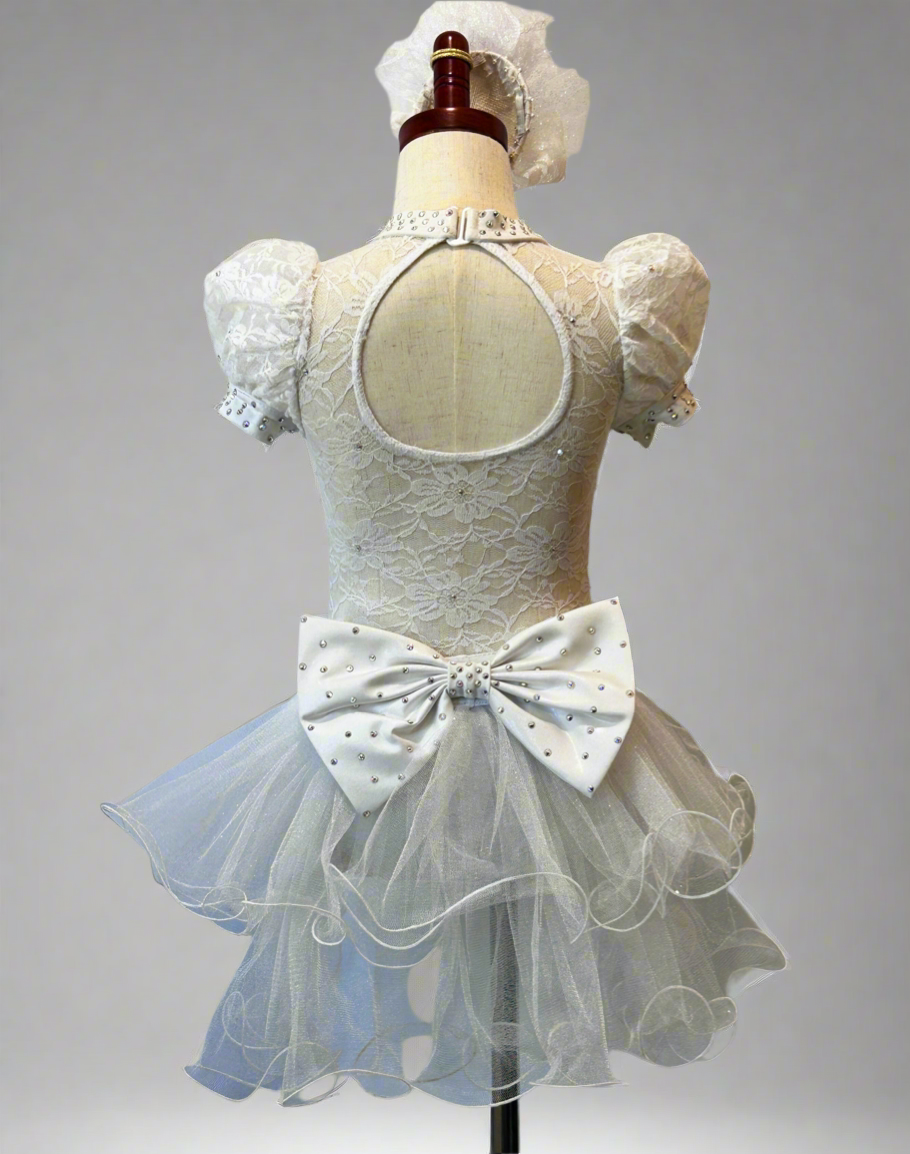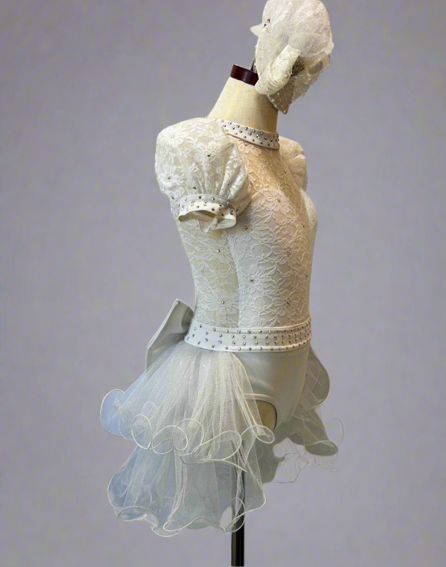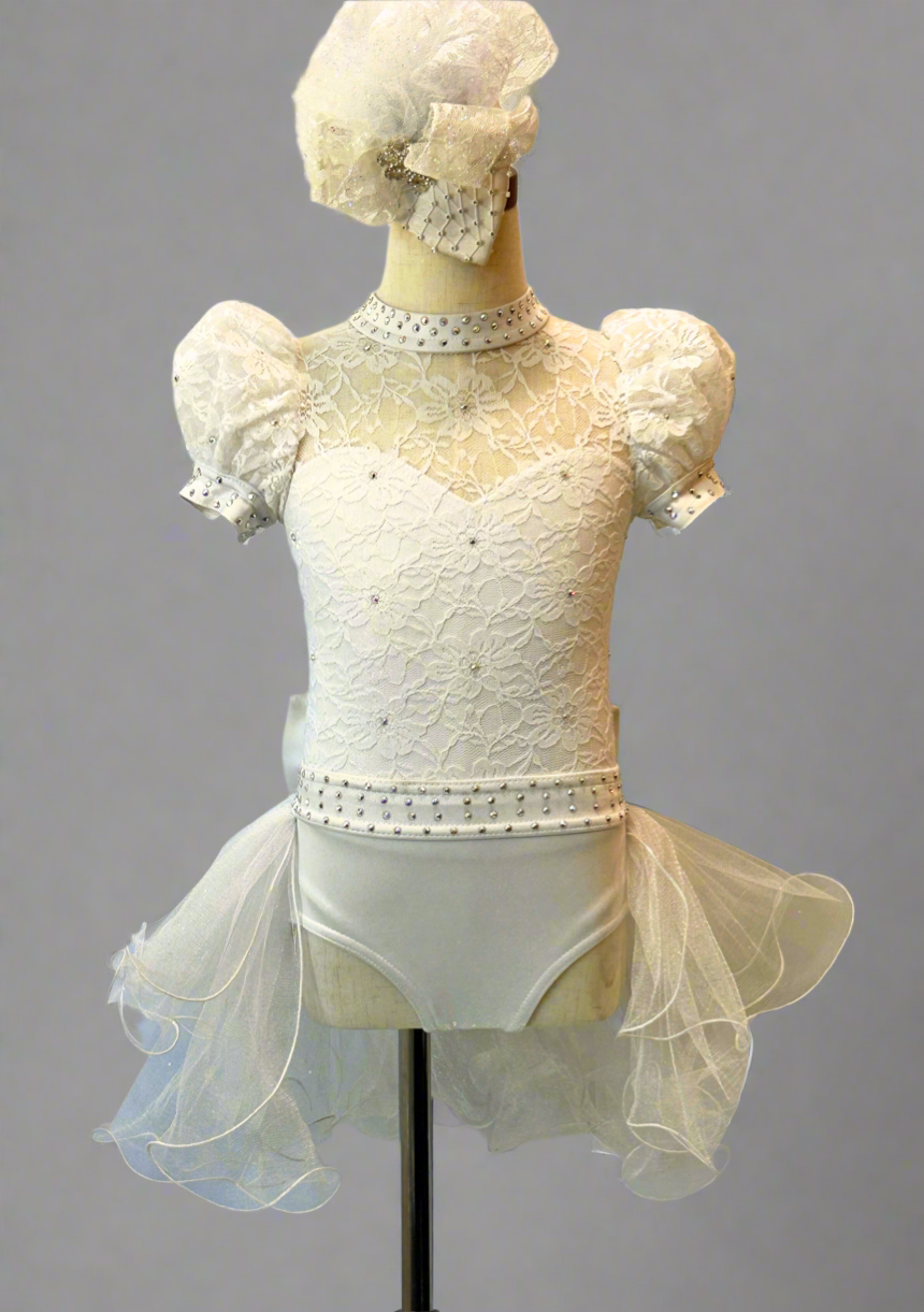 This is a perfect custom piece for that wedding themed dance. The lace overlay leotard has crystal rhinestones scattered throughout. The bustle has a huge bow and is so adorable. Tear drop headpiece included.