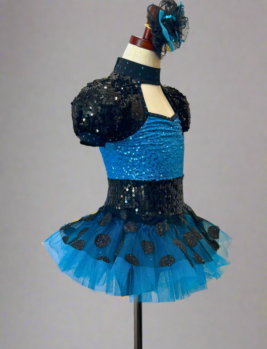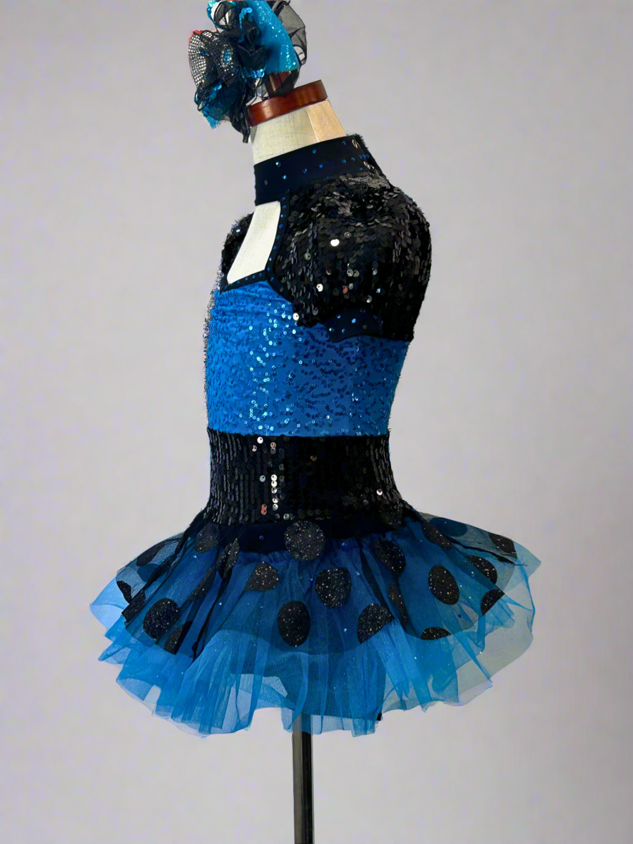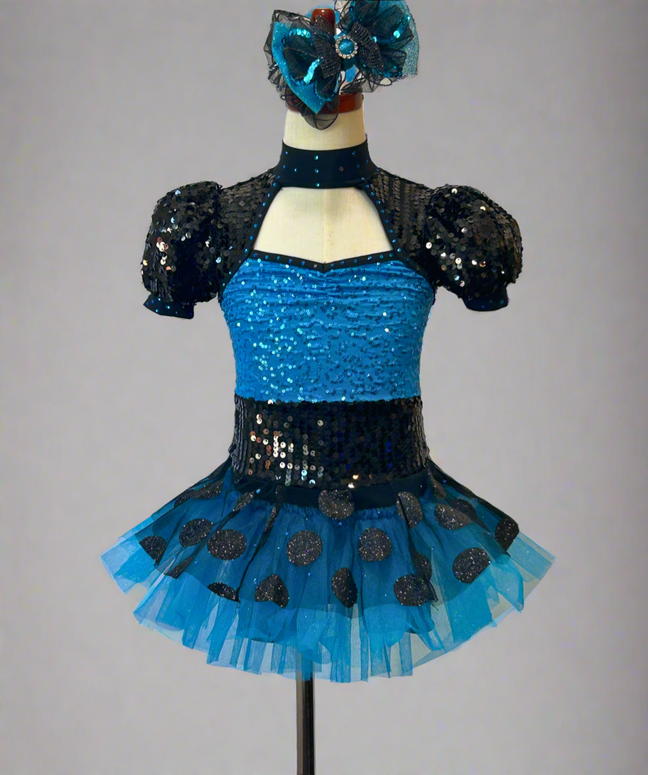 This royal blue and black costume is so cute with puff sleeves and high neck. The bodice is full of sequins and the attached tricot skirts has bike shorts underneath. Matching hair bow included.